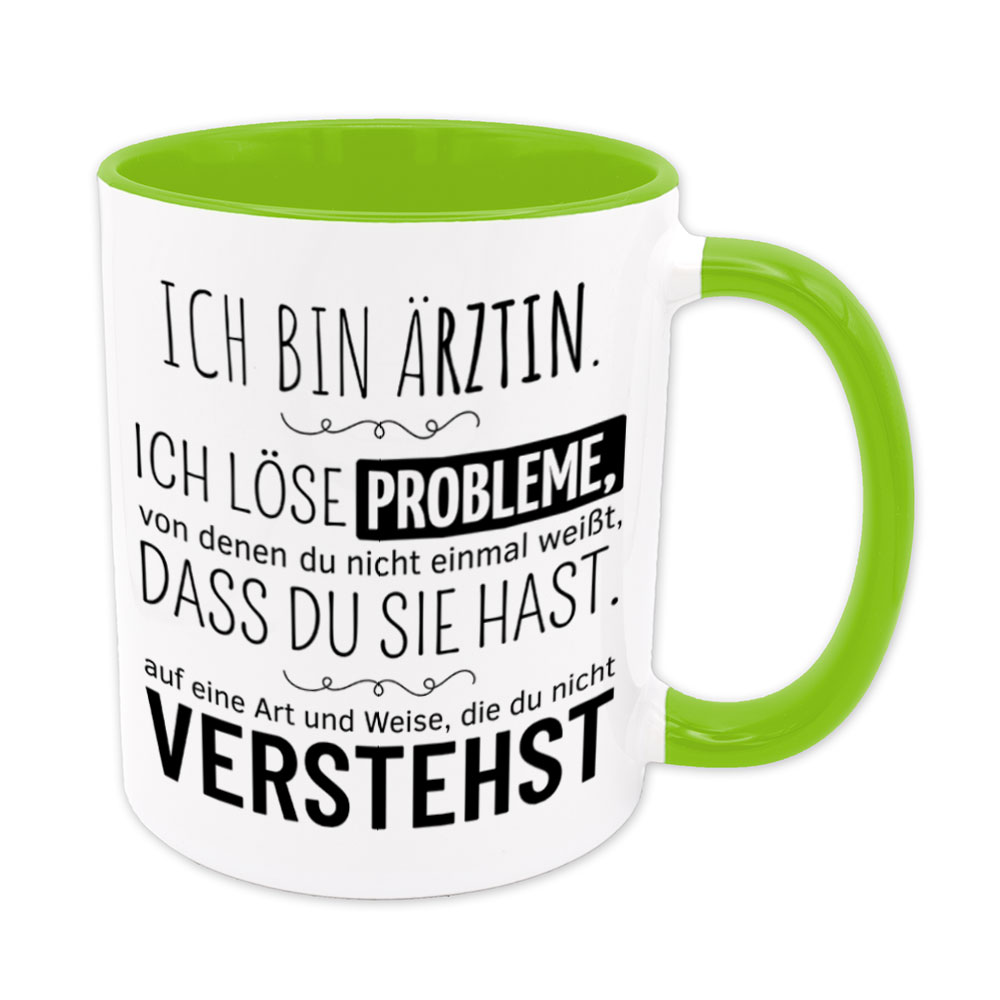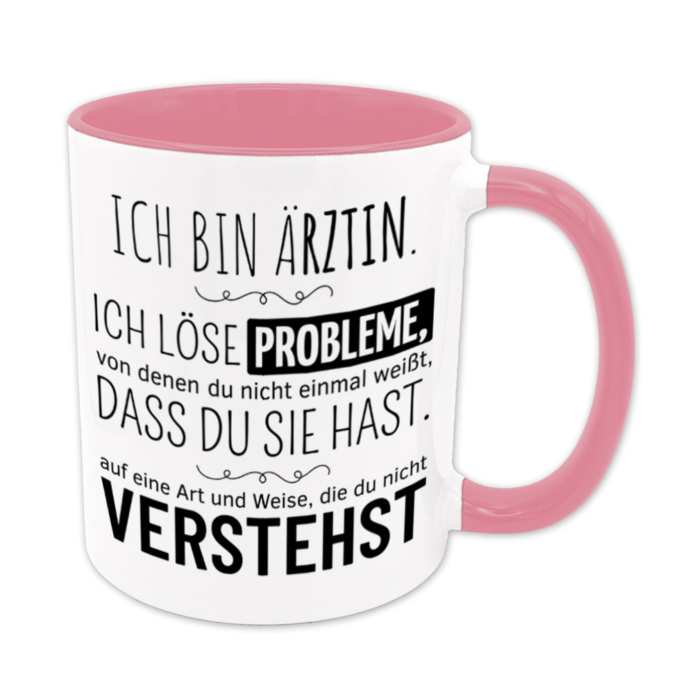 Lustige Spruch-Tasse „Ich bin Ärztin. Ich löse Probleme, von denen du nicht einmal weißt, dass du sie hast, auf eine Art und Weise, die du nicht verstehst.“