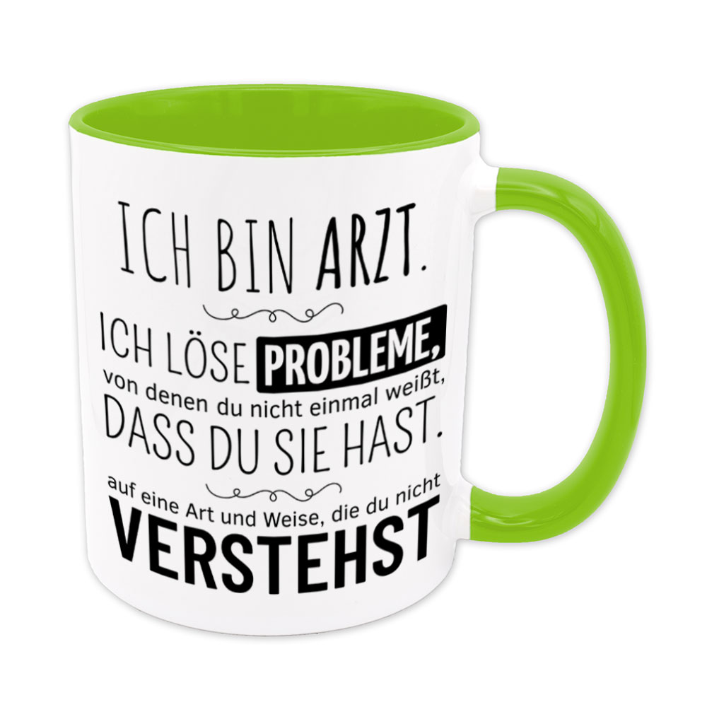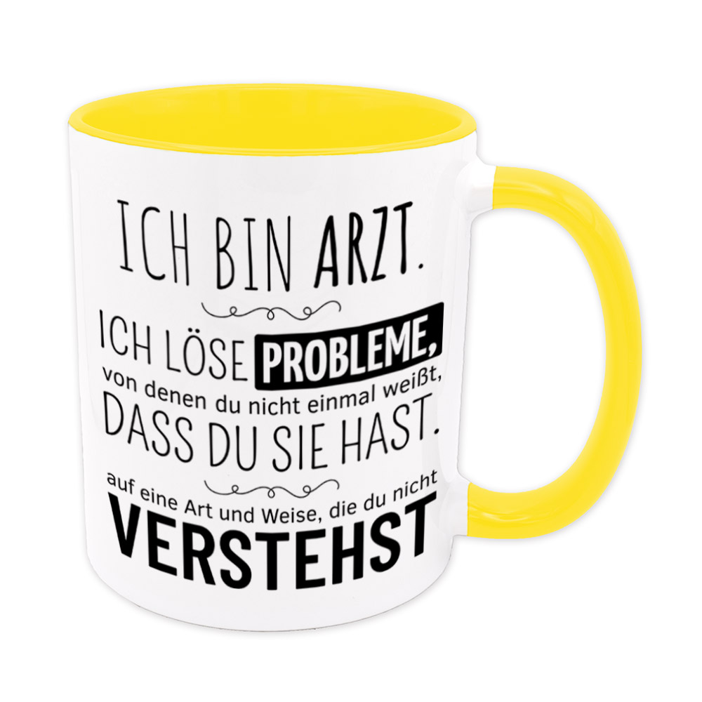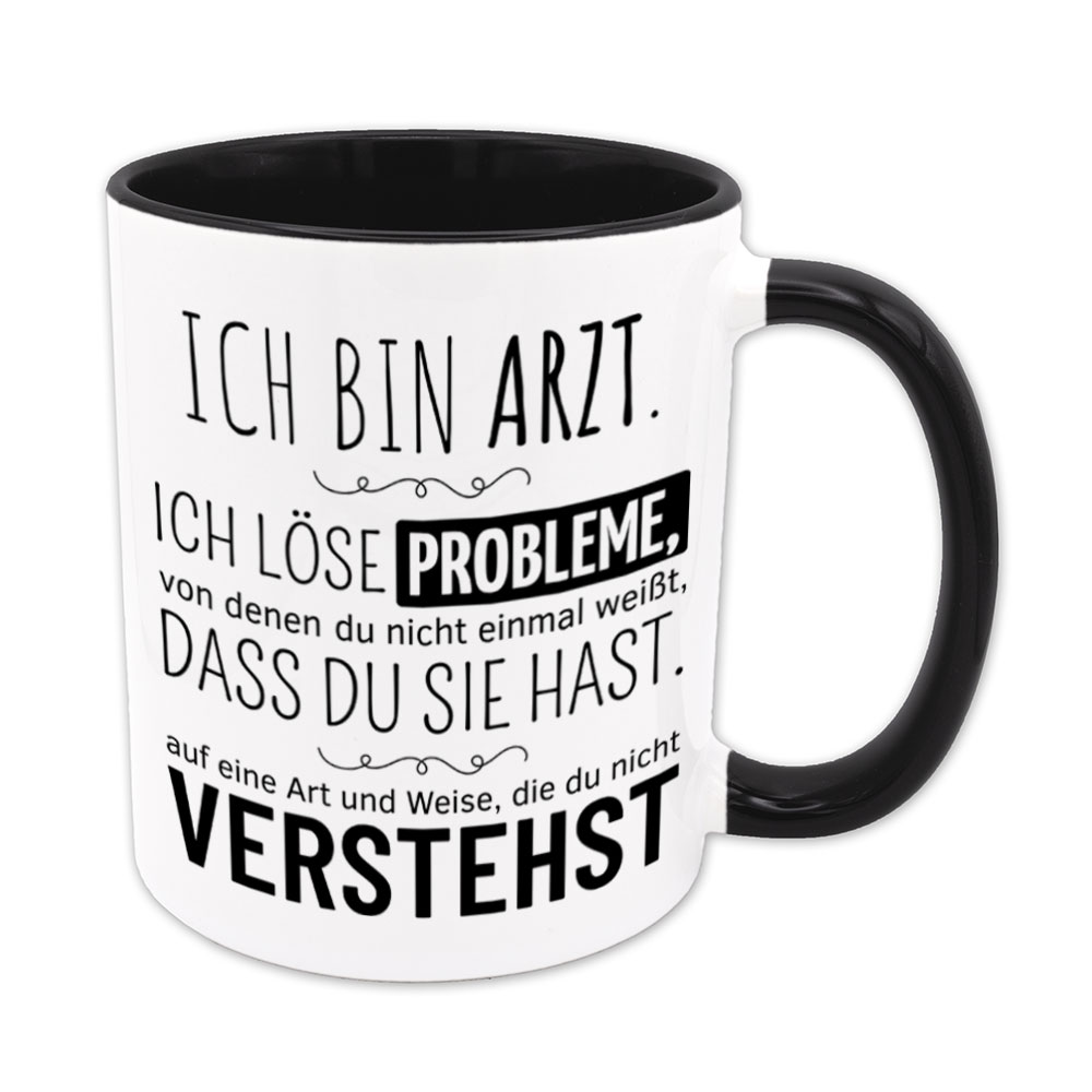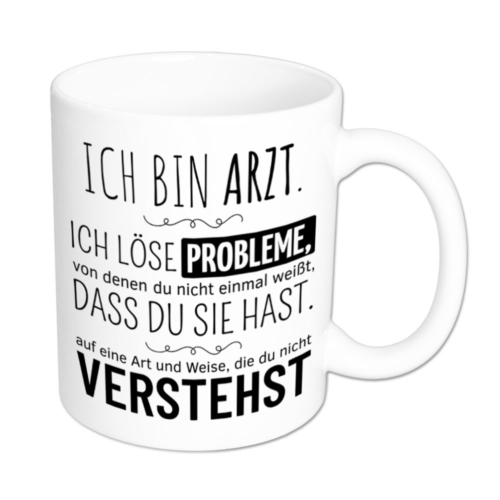Lustige Spruch-Tasse „Ich bin Arzt. Ich löse Probleme, von denen du nicht einmal weißt, dass du sie hast, auf eine Art und Weise, die du nicht verstehst.“