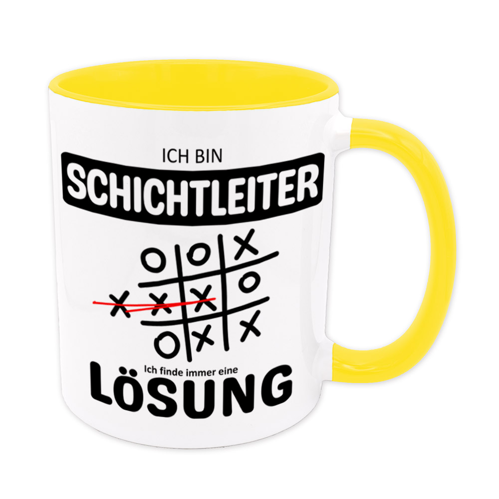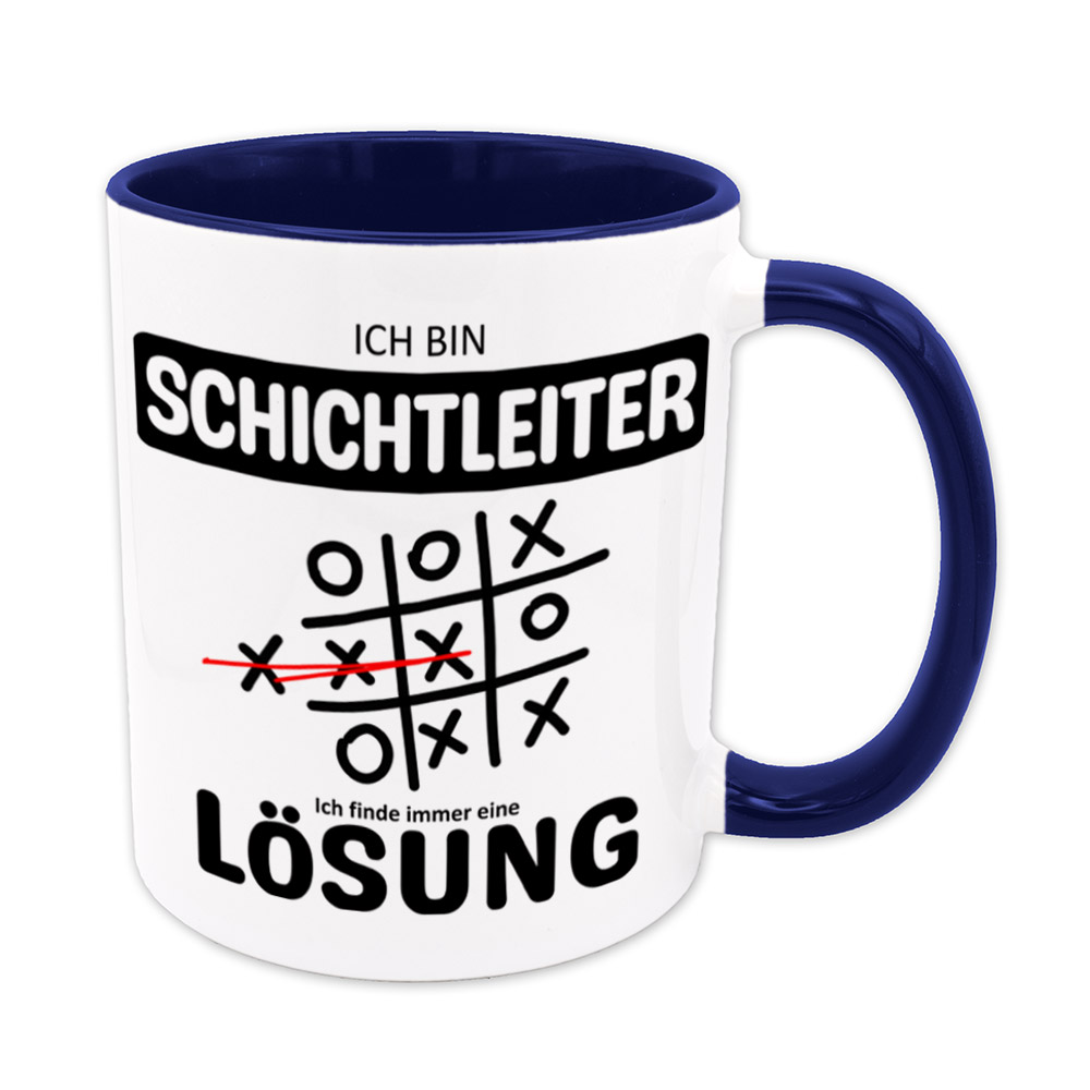 Lustige Spruch-Tasse „Ich bin Schichtleiter. Ich finde immer eine Lösung“. Tic Tac Toe – Tasse