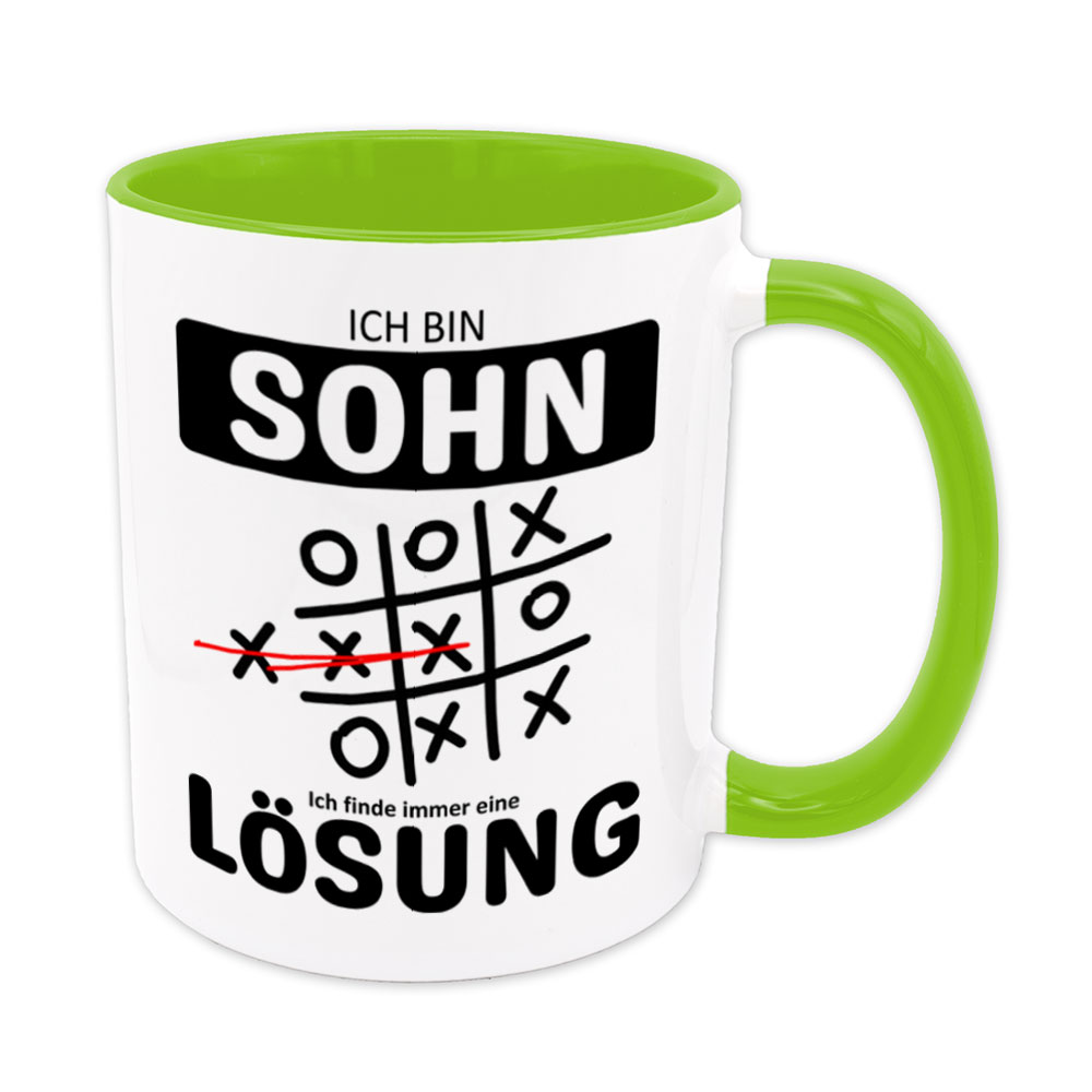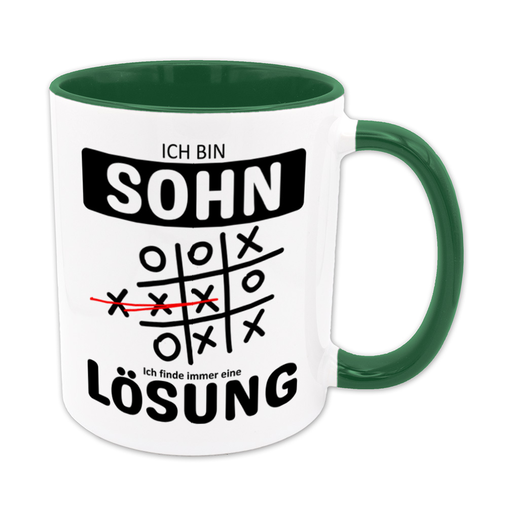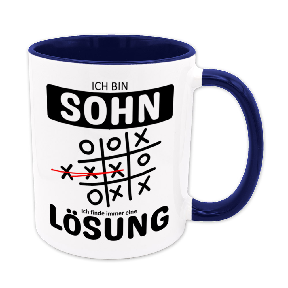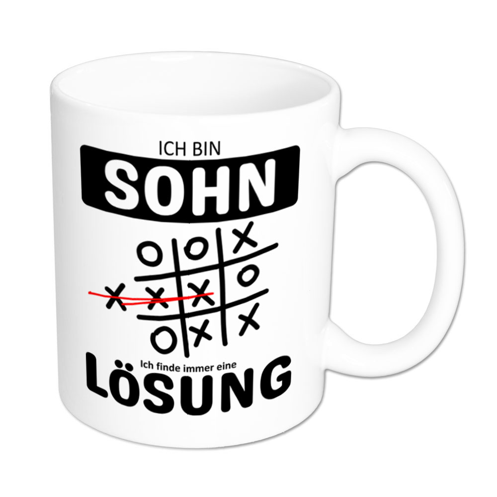 Lustige Spruch-Tasse „Ich bin Sohn. Ich finde immer eine Lösung“. Tic Tac Toe – Tasse